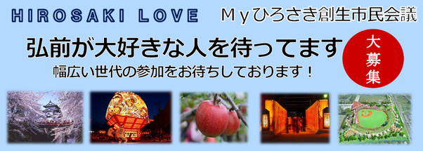 平成28年度から、市民の皆様が主体となって、自分の(My)弘前、ふるさと弘前について、新たな『はな』(価値、魅力、資源等)やまちづくりの方向性等について話し合う場として、「Myひろさき創生市民会議」を開催しています。