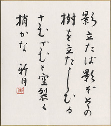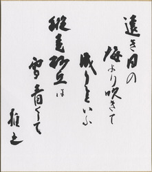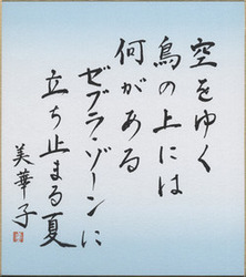 梅内美華子は、昭和45年に青森県八戸市に生まれた。平成3年「横断歩道(ゼブラ・ゾーン)」で第37回角川短歌賞を受賞。色紙の歌「空をゆく鳥の上には何がある ゼブラ・ゾーンに立ち止まる夏」は「横断歩道」に収められた一首。 〈『横断歩道』は青森県近代文学館蔵〉