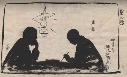青森県歌壇の先達・加藤東籬と和田山蘭の2人が、青森県北津軽郡松島村(現・五所川原市)で新派和歌研究会「蘭菊会」を結成したのは、明治39年1月のことであった。42年1月には回覧雑誌を発行。第1号『白日』の扉には次のような言葉が記されている。「蒼茫として大なるかな詩の野-ねがはくは吾等をしておもふまヽ歌はしめよ叫ばしめよ」。回覧雑誌は毎号誌名を変え第14号(43年12月)まで続いた。この挿絵には回覧雑誌の編集にいそしむ東籬と山蘭の影法師が描かれている。 〈青森県近代文学館蔵〉