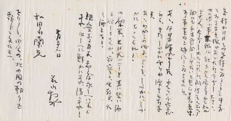 明治44年11月、青森県初の活版印刷による短歌雑誌『東北』が加藤東籬、和田山蘭、越前翠村らによって発行された。3人はいずれも若山牧水に心酔しており、『東北』は牧水の『創作』の系統誌の感が強いものであった。この書簡は『東北』創刊の翌年に牧水が山蘭に宛てた1通である。書中には次のような一節がある。「山蘭君、君は火のごとき青い碧い酒を欲しませんか、寂寥と、生存と、火と、酒とを! 親愛なる友よ、希くば永しへに若くあれ、永しへに鮮かにあれ、清くあれ!」 〈五所川原市教育委員会蔵〉