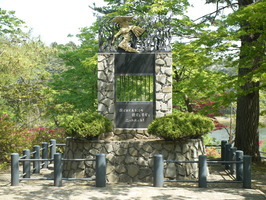 左から『千代女』(筑摩書房 昭和16年)、『女性』(博文館 昭和17年)、芦野公園に建つ太宰治碑