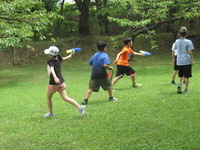 「自然と遊ぼう」と題し、ドッチボールとドッヂビーを合わせたゲーム、背景さがしや水風船を使った活動を行いました。