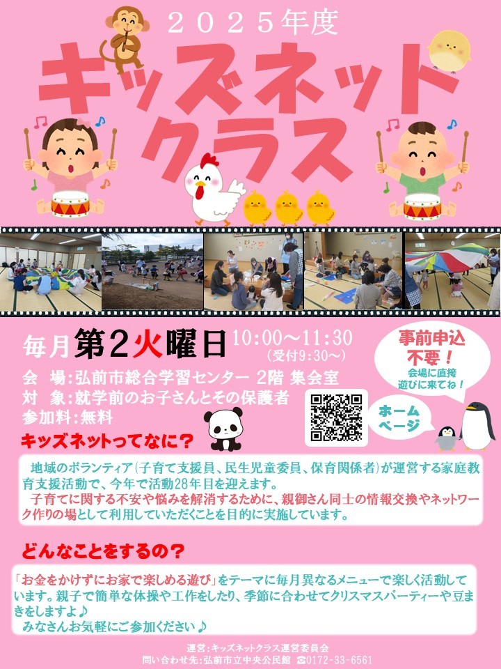 キッズネットクラスは、未就学児と保護者が、子どもと一緒にできる簡単な体操やものづくりなどを通して、楽しく遊びながら育児に関する情報交換や相談ができる場です。