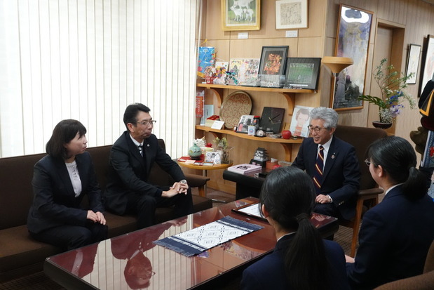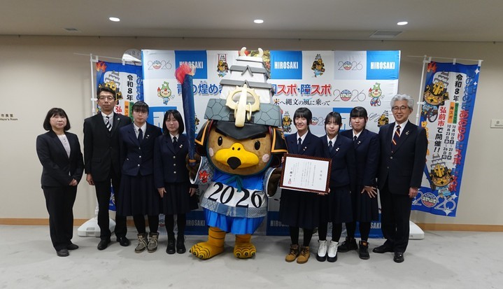 弘前実業高等学校の對馬嘉晴校長、担当教諭、服飾デザイン科3年生5名の計7名が市役所を訪れました。