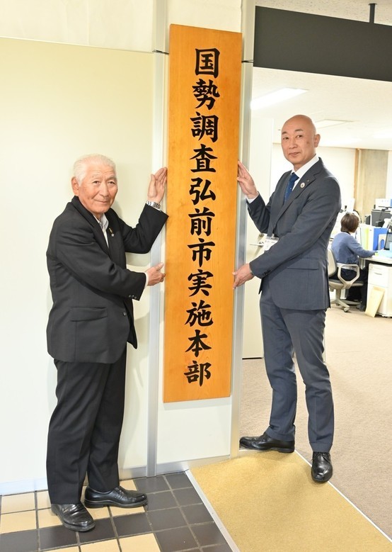 令和7年5月1日、本部長(企画部長)と弘前市統計協会の鳴海会長によって実施本部の看板が弘前市役所広聴広報課内に掲げられました。
