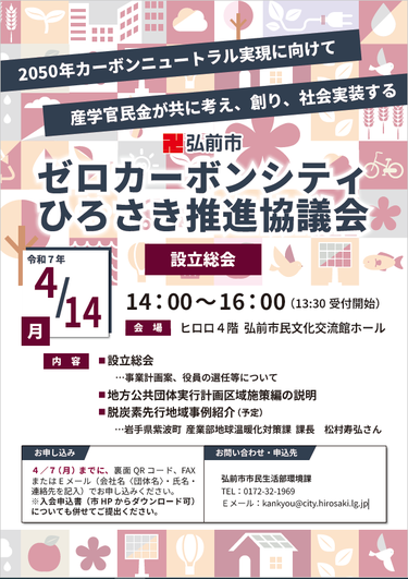 市では、令和6年2月に「ゼロカーボンシティひろさき」を宣言し、2050年までの二酸化炭素実質排出量ゼロに向けて、市民、事業者、行政が協働して取り組むこととしております。