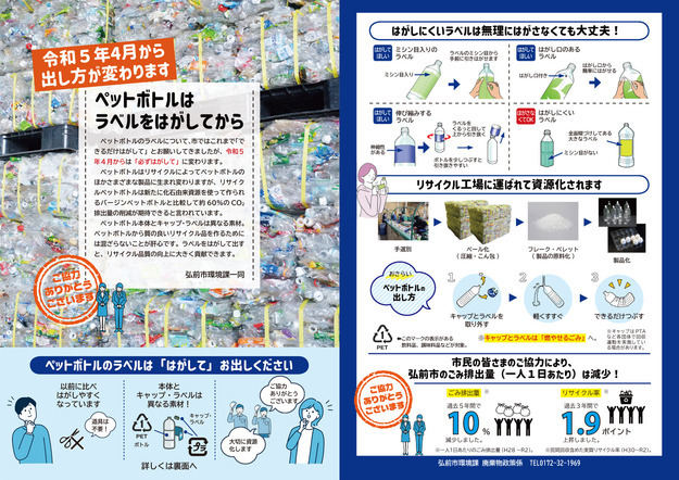 市ではこれまでペットボトルをごみに出す際は、ラベルについて「できるだけはがして出してください」とお願いしてきましたが、より高品質なリサイクルを行うため、令和5年4月からは、「必ずはがして出す」に変更になっています。