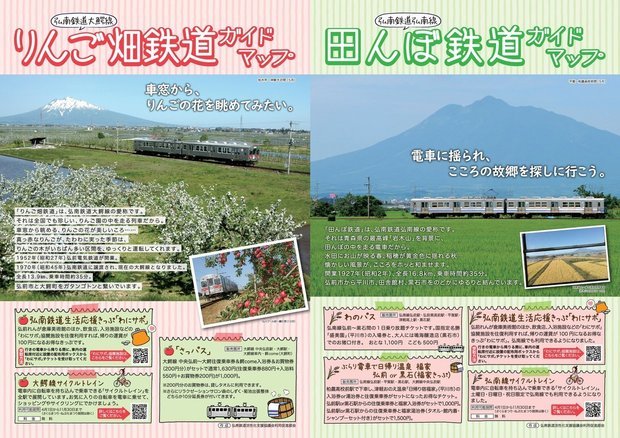 弘南鉄道ガイドマップ・まち歩きマップは、弘南線・大鰐線の路線紹介、お得なきっぷの情報のほか、両線を俯瞰したマップとともに沿線の体験できるスポット、各駅からのモデルコースなどを掲載したガイドマップです。