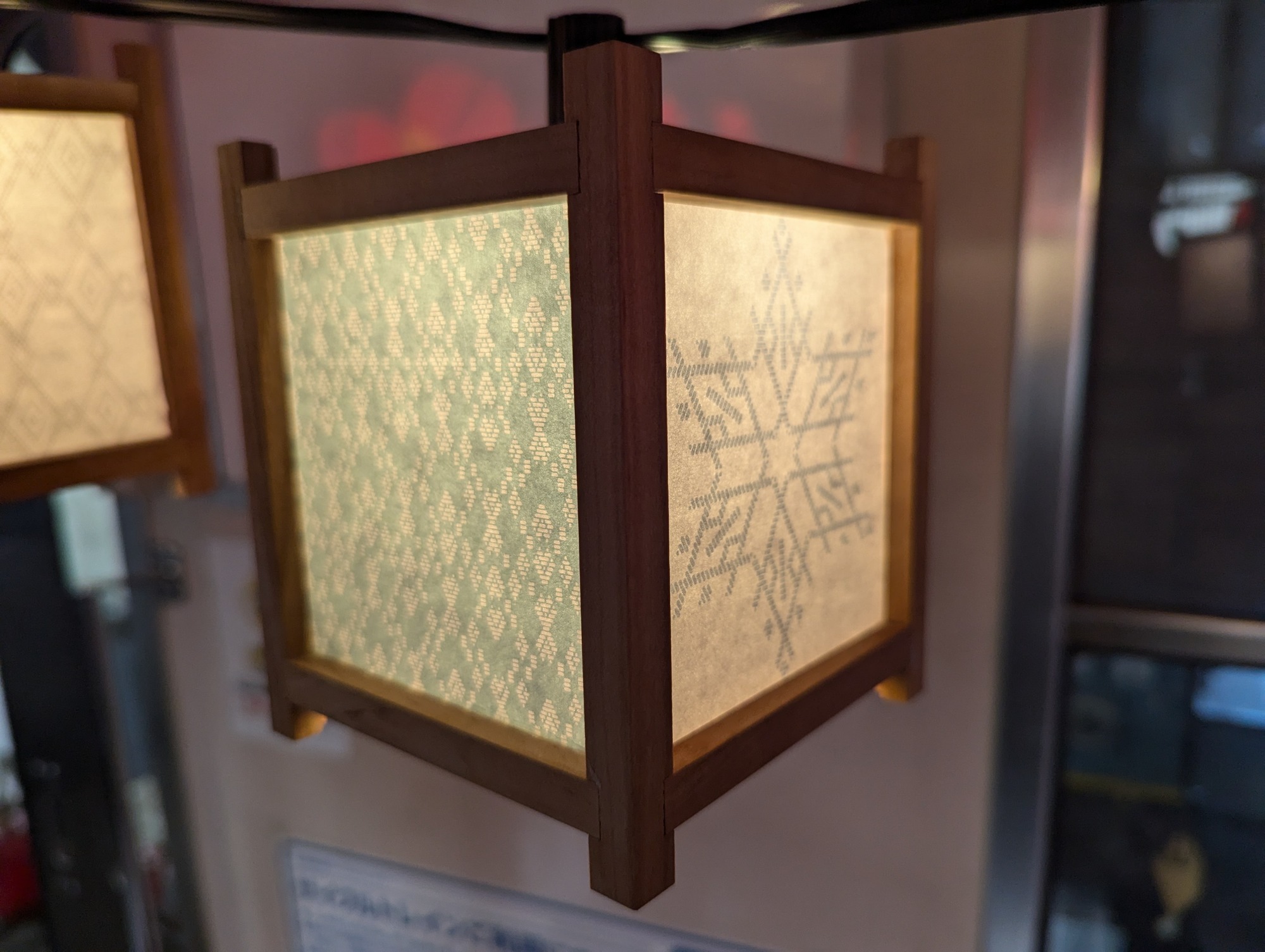 「津軽七雪こぎん灯篭」のミニチュア版は、大鰐線の愛称「りんご畑鉄道」にちなんで、りんごの木を用いて一つ一つ手作りで組んだ木枠に、青森県出身で弘前実業高校卒業のグラフィックデザイナーである山端 家昌氏が監修した「津軽七雪こぎん柄」の和紙を貼った特製品となっています。
