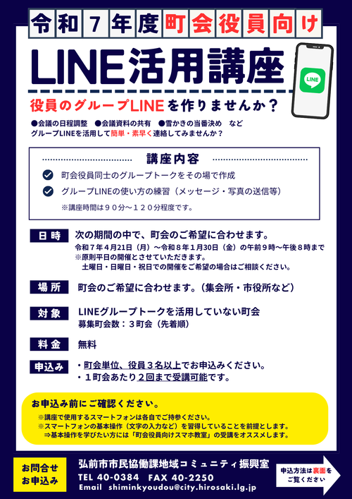 町会運営の負担軽減や効率化、若い世代の方に向けた広報力強化につなげていただくため、町会の為のスマホ教室とLINE講座2種を開催いたします。