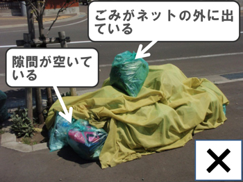 防鳥ネットは、単にごみの上に掛けているだけでは、カラスが防鳥ネットを引っ張り、ごみを荒らすケースもあるため、ごみ袋がはみ出さないようにし、すき間を開けずに、ごみ袋全体を包み込むようにする必要があります。
