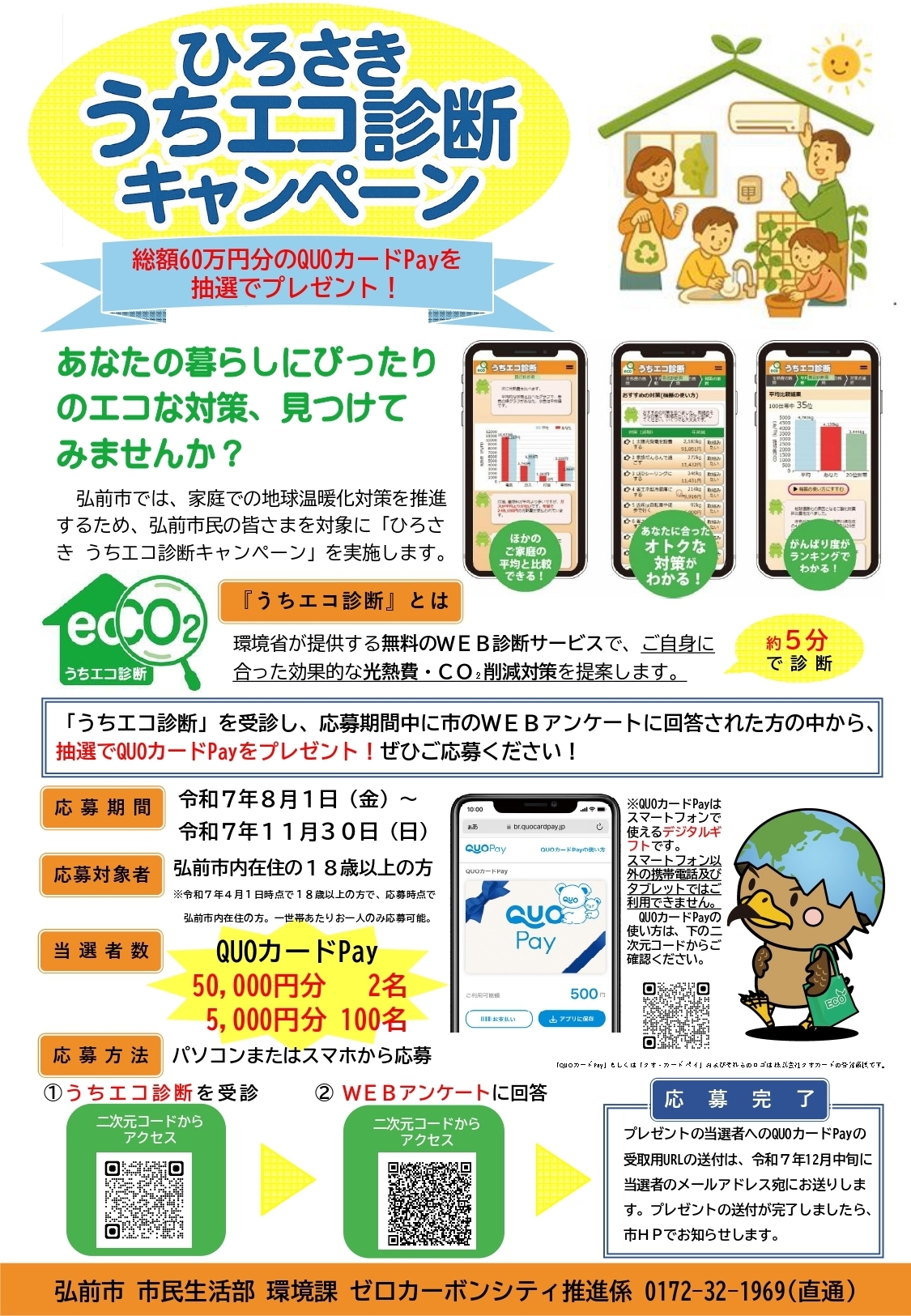 - 「ひろさきうちエコ診断キャンペーン」は弘前市が実施しています。「ひろさきうちエコ診断キャンペーン」についてのお問い合わせは株式会社クオカードではお受け出来ません。