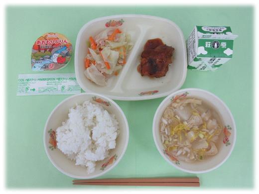 ・ごはん ・鶏肉くわ焼き ・キャベツとツナの和え物