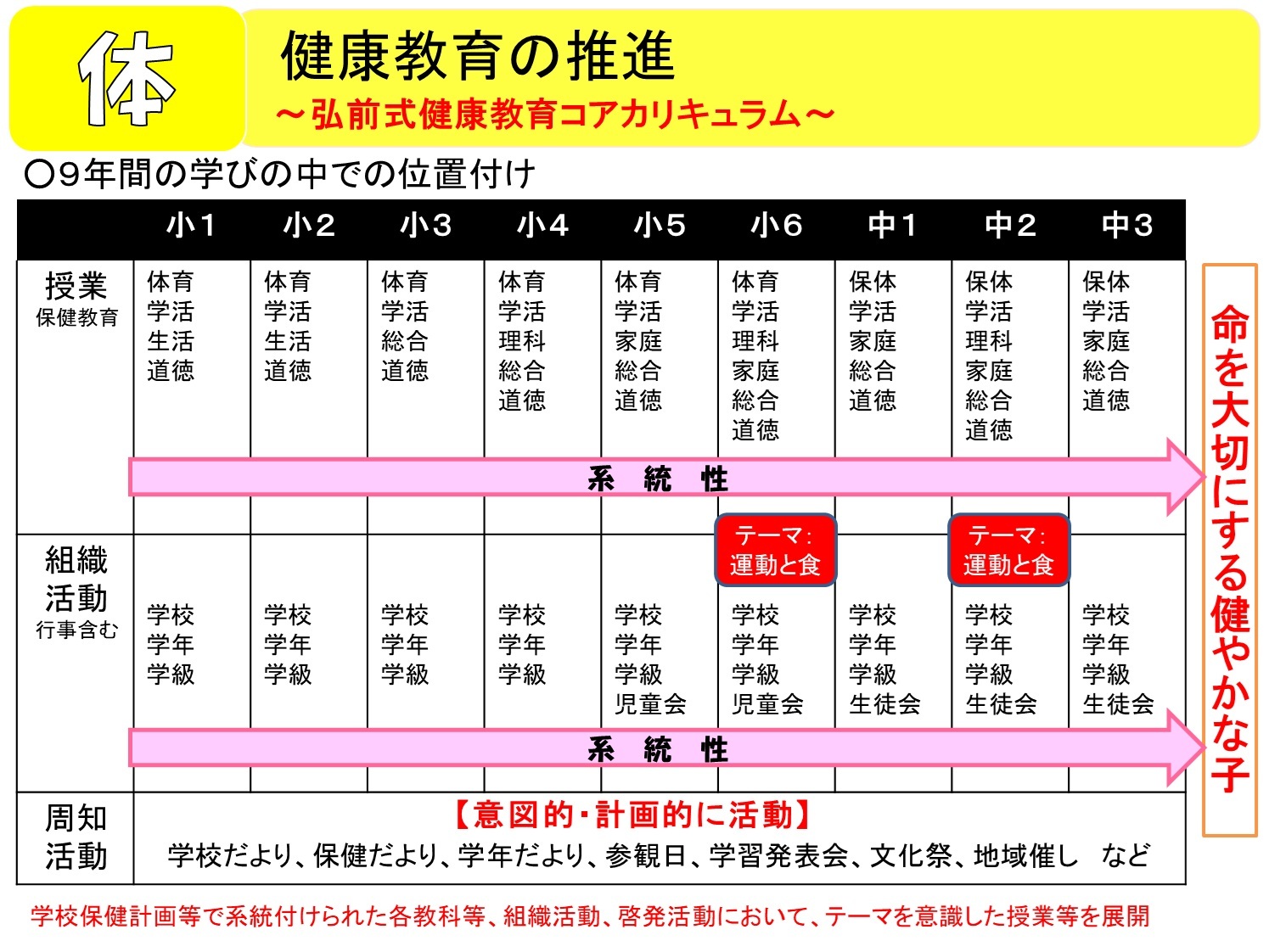 弘前市では、平成30年度から中学校区ごとに小・中学校が目指す子ども像を共有し、9年間を通じた教育課程を編成し、系統的な教育を目指す「小中一貫教育」を導入しています。