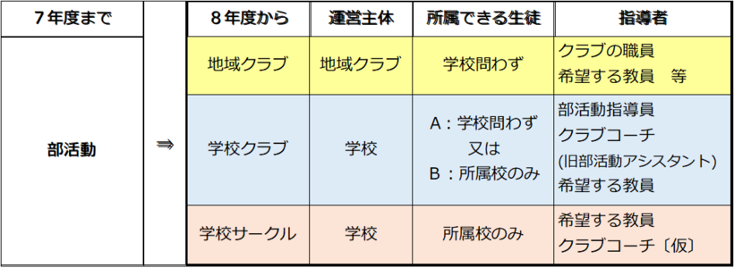 クラブ化には、現段階として二つの方法が考えられます。指導面だけでなく、管理面も地域団体等に任せる「地域クラブ」に移行させる方法と、管理面は学校が行う「学校クラブ」に改革する方法があります。