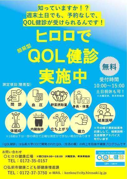※より多くの測定項目で健康度合いを測ることができる「QOL健診(定期開催)」もございます。こちらは事前予約制となっております。詳しくは、広報ひろさきもしくは「ヒロロでQOL健診 受診者募集」をご覧ください。