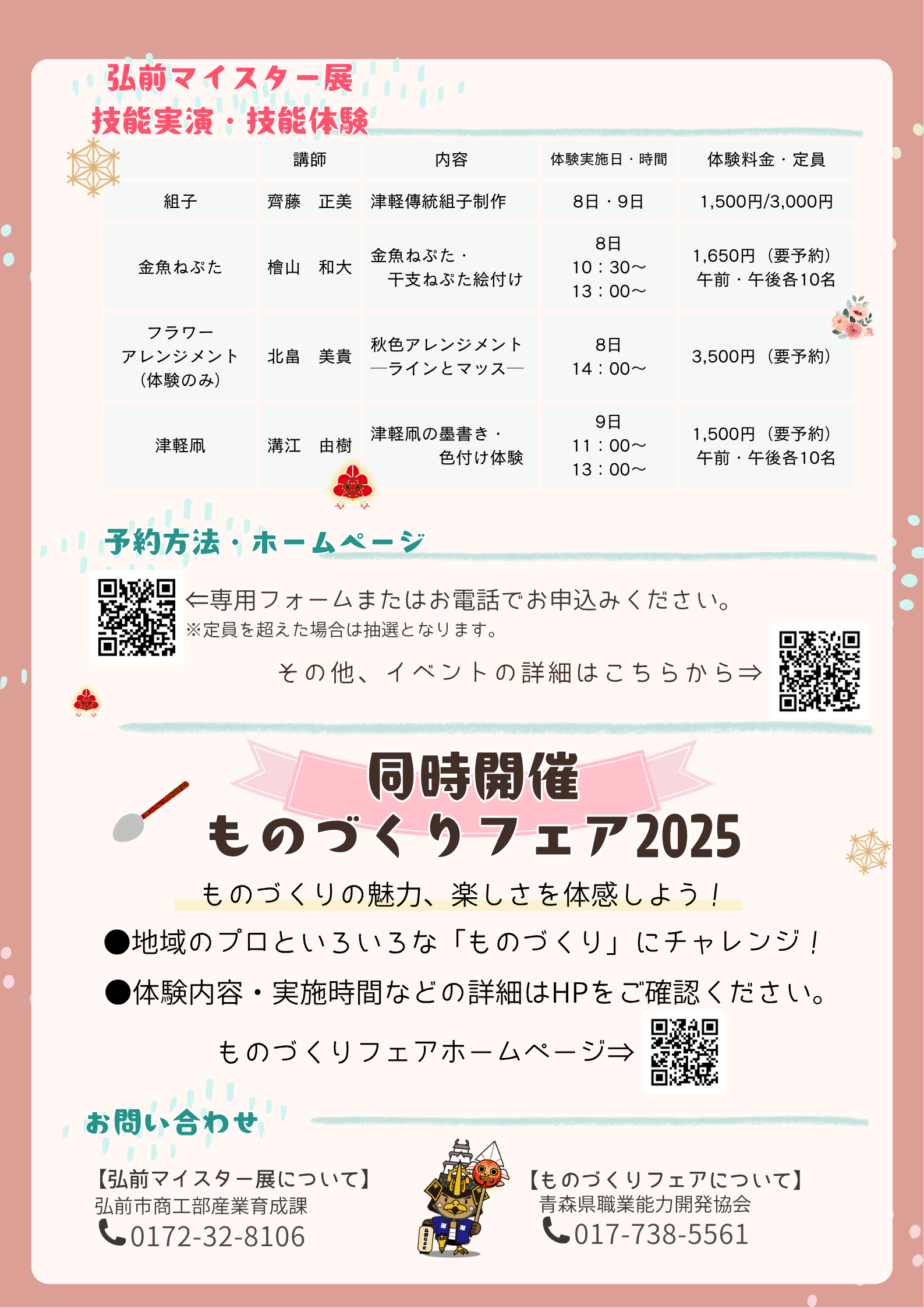 このたび、これまで認定を受けたマイスター48名の概要や技術を紹介するため、以下のとおり弘前マイスター展を開催します。
