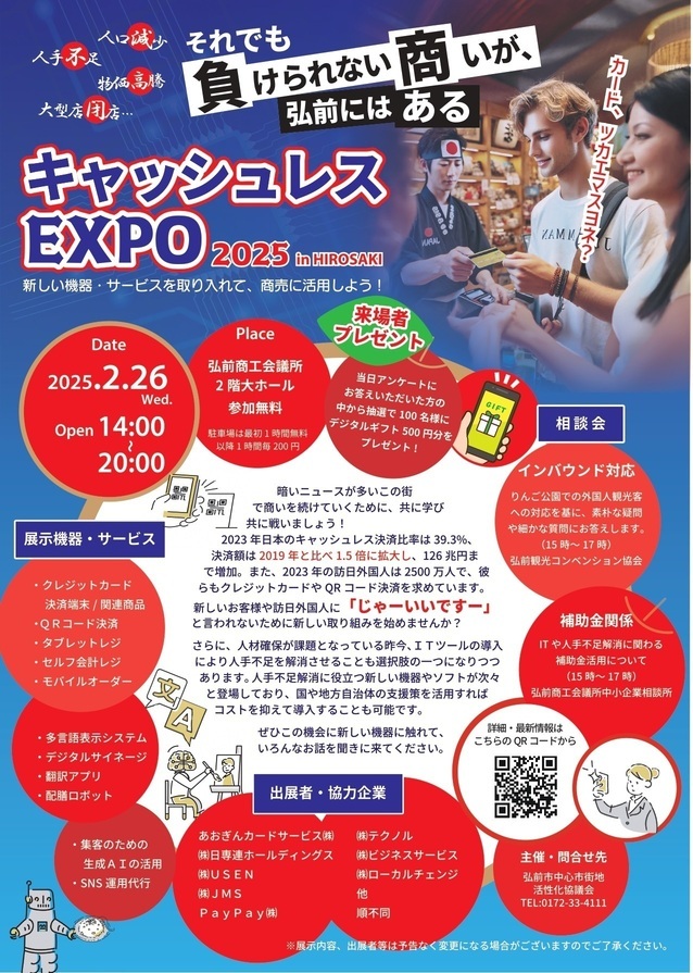 インバウンドの増加や事業者の人手不足等に対応するツールとして、キャッシュレス、IT機器などの普及促進を図ることを目的に、キャッシュレスEXPO2025inHIROSAKIが開催されます。
