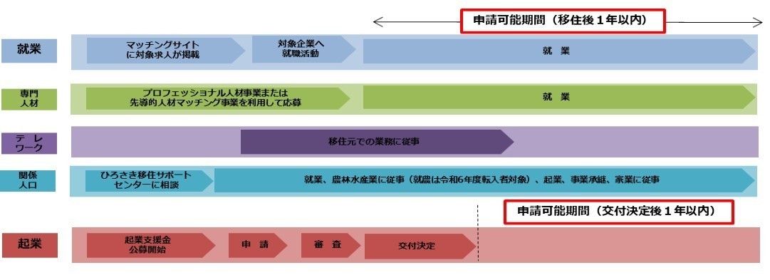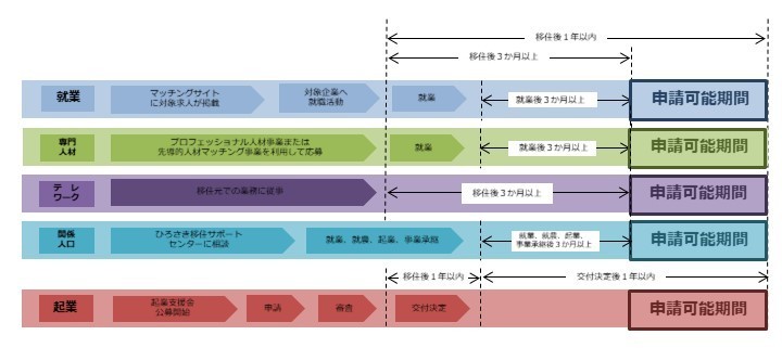 次の共通要件すべてに該当し、「就業」、「専門人材」、「テレワーク」、「関係人口」、「起業」のいずれかに該当する方が交付対象となります。