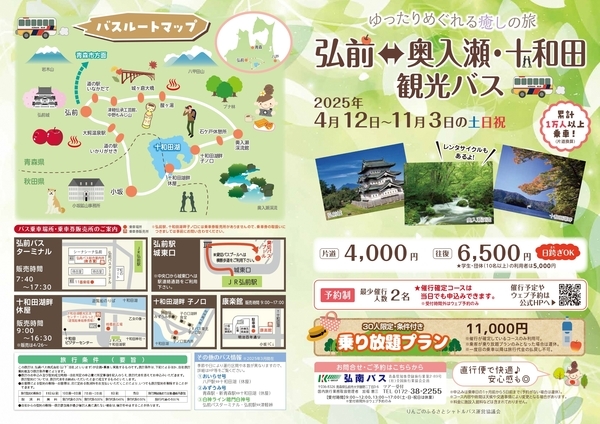 弘前と奥入瀬・十和田を結び、道の駅など観光スポットにも立ち寄る観光バスを11月3日までの土日祝で運行。2回往復乗車でお得になる「乗り放題プラン」もあります!