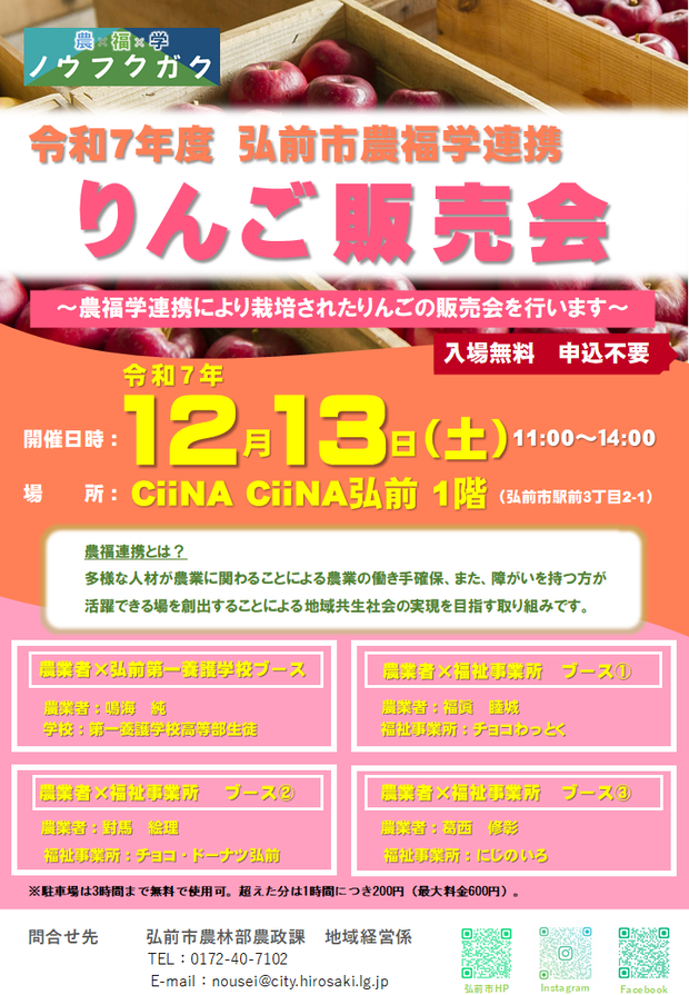 農業者と障がい福祉事業所及び弘前第一養護学校が農福学連携により収穫したりんご等を販売します。