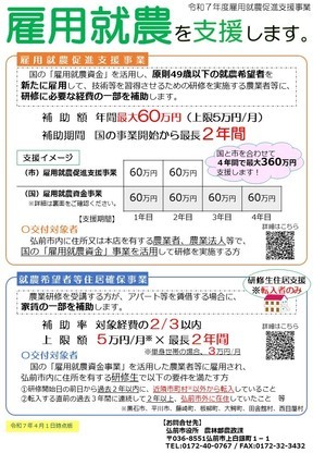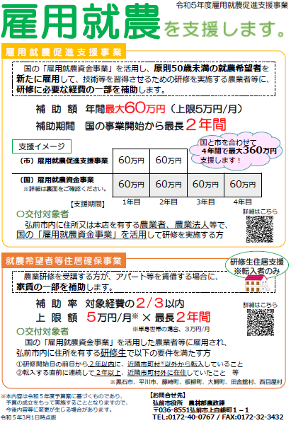 県外からの移住者を雇用する予定またはお考えの農業者向けに、移住担当部門(弘前市・県)においても無料職業紹介事業や、採用される方向けの様々な支援制度があります。
