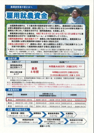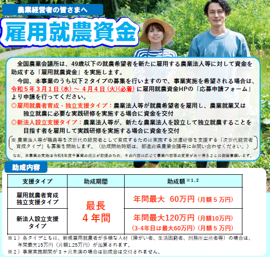 全国農業会議所では、原則49歳以下の就農希望者を新たに雇用し、通年で農業就業又は独立就農に必要な技術・経営ノウハウ等を習得させるための研修を実施する農業者等に対して、「雇用就農資金」を交付しています。