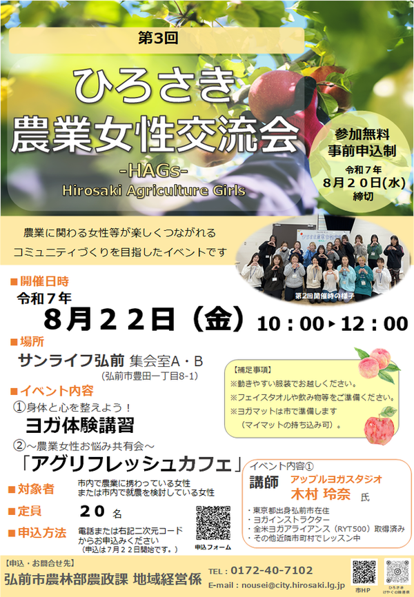 「ひろさき農業女性交流会」は、女性農業者などを対象に一緒に身体を動かしたり、女性農業者ならではの課題等や日頃の悩みなどを共有したりすることで、農業に関わる女性などが楽しくつながれる交流の場です。