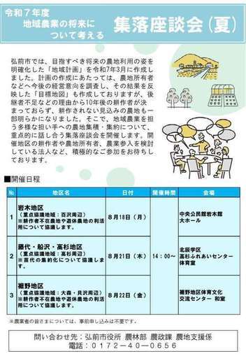 そこで、今年度は3つの地区を選定し、地域農業を担う多様な担い手への農地集積・集約について重点的に話し合うため、下記のとおり夏の集落座談会を開催いたします。
