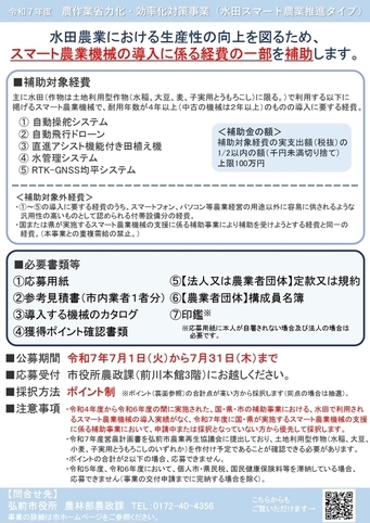 - 令和4年度から令和6年度において、国・県・市の事業を活用し、水田で利用されるスマート農業機械を導入していない方、又は、本事業もしくは、令和7年度に国又は県が実施するスマート農業機械の支援に係る補助事業において、申請中又は水田で利用されるスマート農業機械が採択となっていない方から優先してポイントが高い順に採択します。