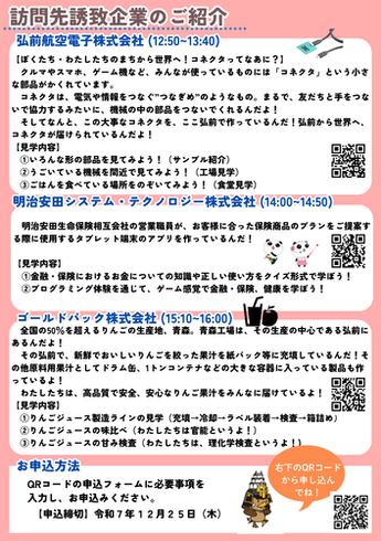 義務教育の時期に、産業教育の一環として誘致企業の見学を通じて職業観を養ってもらい、かつ、誘致企業の認知度が向上することで、就業人材の獲得を図るため、誘致企業体験ツアーを開催しています。