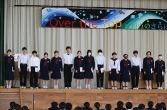5月13日(月)前期生徒総会が行われ、三上生徒会長が次のように所信表明を発表しました。「僕たち第76期生徒会は「OVER THE TOP~頂点の更に上へ~」を生徒会テーマに掲げ、活動してきました。このテーマを実現させるために、まずは基本を大切にしていきましょう。土台がしっかりとしていないまま上を目指していっても、頂点の更に上へ行くことはできないと思います。昨年から不要物の持ち込みがあり、今年度に入ってもまだ完全には無くなっていません。そのようなことを無くしていかなければ、基本という土台ができあがりません。基本がなっていないままに上を目指しても、すぐに崩れてしまうと思います。基本を徹底した上で、高みを目指していけるよう尽力していきますので、みなさんもご協力をお願いします。( 中略 ) 学校の目標である「自ら学び 共に学び合い 心豊かにたくましく」のように、お互いを認め合いながら、共に高め合い、さまざまな面で向上することで、充実した学校生活を送れるようにしたいと思っています。