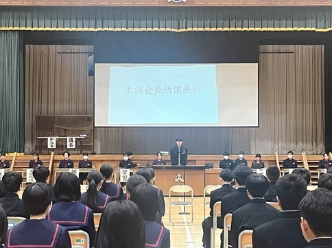 私たち第77期生徒会は、全校のみなさんと新役員14名でスタートしました。この 77 期生徒会では、全校の皆さんの意見を尊重し、皆さんで作る皆さんのための生徒会を目標としています。演説で話した公約を実現できるように精一杯努めていきたいと思います。