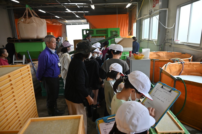 はじめに田中課長補佐からコメの品種は950ほどあり、このうちおよそ300品種が食用であることなどを教わりました。そして種まき用の機械を見学し、県のブランド米「青天の霹靂」の種もみや土が育苗箱にまかれていく様子を興味深そうに眺めていました。また、塩水を使って選別された品質のよい種もみの袋を持って重さを確かめたり、水蒸気で加温して発芽させる機器を見学したりしました。