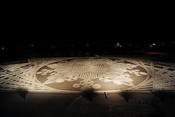 田んぼをキャンバスに見立て7色13種類の稲で描く田舎館村の「田んぼアート」は年々芸術性を高めており、毎年20万人以上の観光客が訪れる、日本でも有数な観光スポットです。 春から公開が始まる色の異なる小石を並べて著名な故人や、田んぼアートにちなんだ短文芸作品を描く「石のアート」、夏から秋の「田んぼアート」、雪原をスノーシューで歩き、その足跡で模様を描くスノーアートによる「冬の田んぼアート」と、四季とともにアートが楽しめる村を目指しています。 |