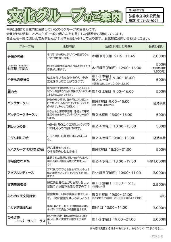 各グループの見学や入会を希望される方は中央公民館までお問い合わせください。
