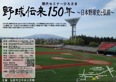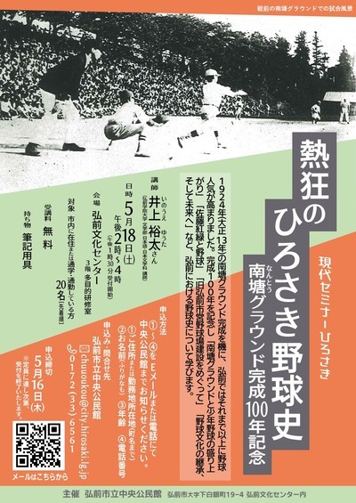 内容:1924(大正13)年の南塘グラウンド完成を機に、弘前ではそれまで以上に野球人気が高まりました。完成100年を記念して、この講座では「南塘グラウンドと少年野球の盛り上がり」「佐藤紅緑と野球」「旧弘前市営球場建設をめぐって」「野球文化の継承、そして未来へ」など弘前における野球史について学びました。