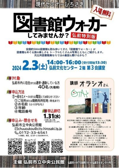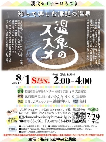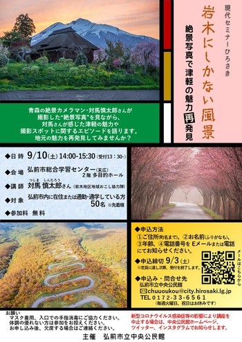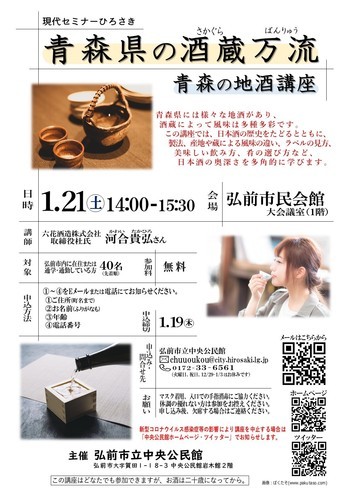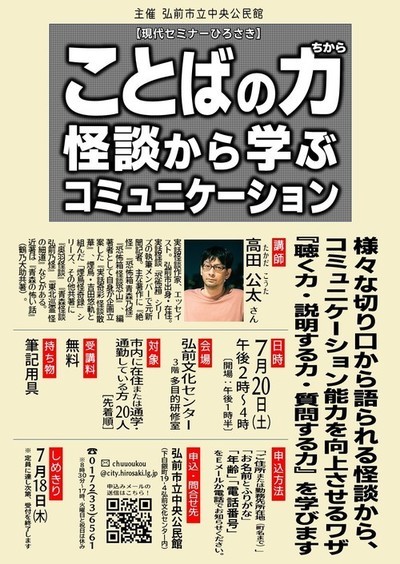 7月「耳で聴く新・弘前人物志~近代日本を支えた人物~」 10月「市民公開講座~学生団体『選挙へゴ―!!』企画~」 11月「耳で聴く新・弘前人物志~教育に貢献した人物~」 1~2月「現代セミナー特別編」 |