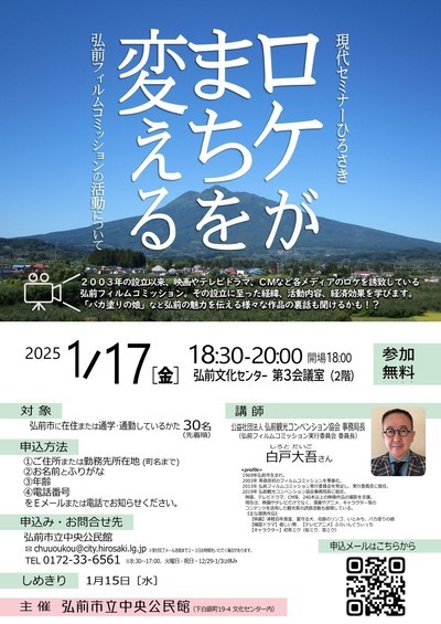 内容:2003年の設立以来、映画やテレビドラマ、CМなど各メディアのロケを誘致している弘前フィルムコミッション。その設立に至った経緯、活動内容、経済効果を学びました。