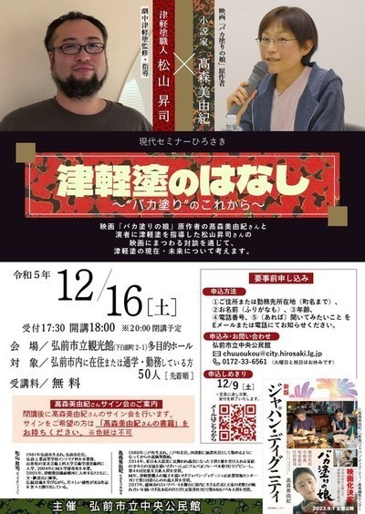 内容:『小説のはなし』『映画のはなし』『津軽塗のはなし』の3つのテーマを設け、髙森さんと松山さんの対談形式で津軽塗の現在・未来について考えたほか、松山さんによる映画の作業シーンの解説も行いました。