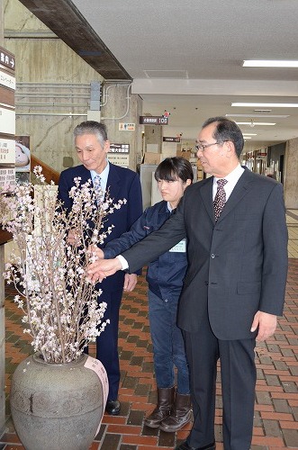 弘前は今日も大雪…。桜の季節はまだまだ先、といったところですが、いただいた『啓翁桜』は、弘前市役所の正面入り口に飾られ、春を待っています。