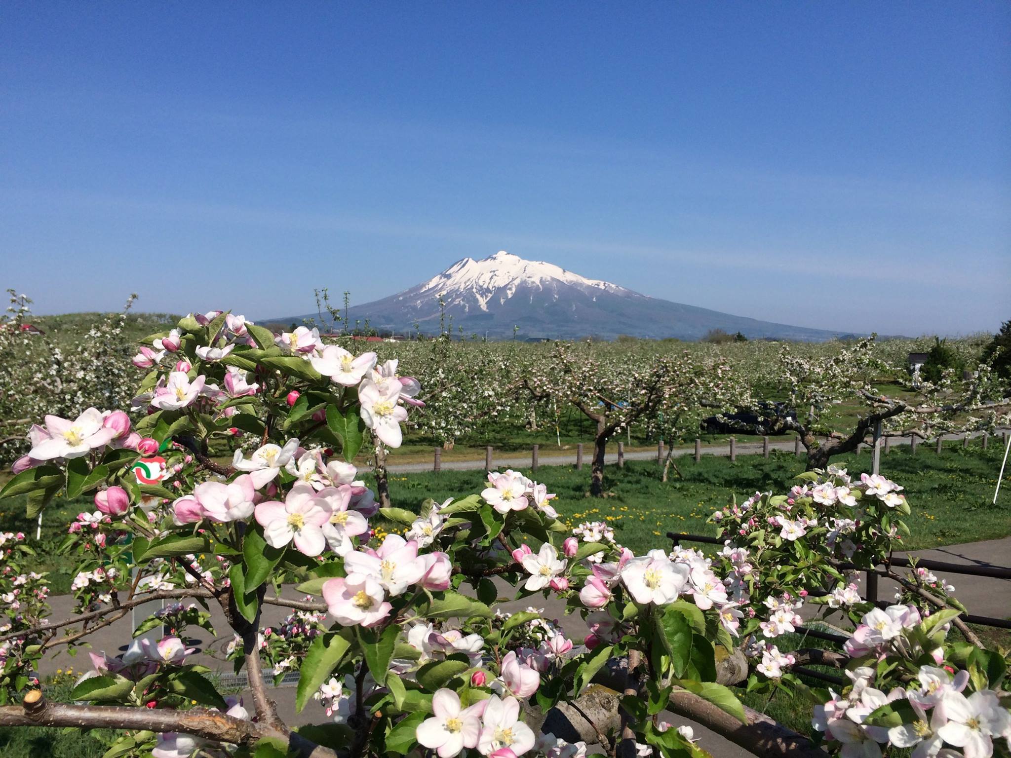 弘前市りんご公園では、明日から、残雪の岩木山を背景にりんごの花や様々なイベントが楽しめる「弘前りんご花まつり」が開催されます。