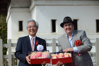 フランスから来弘している技術者パスカル・ガルブ氏を迎え、本日リンゴアートの完成を記念し、除幕式を開催しました。