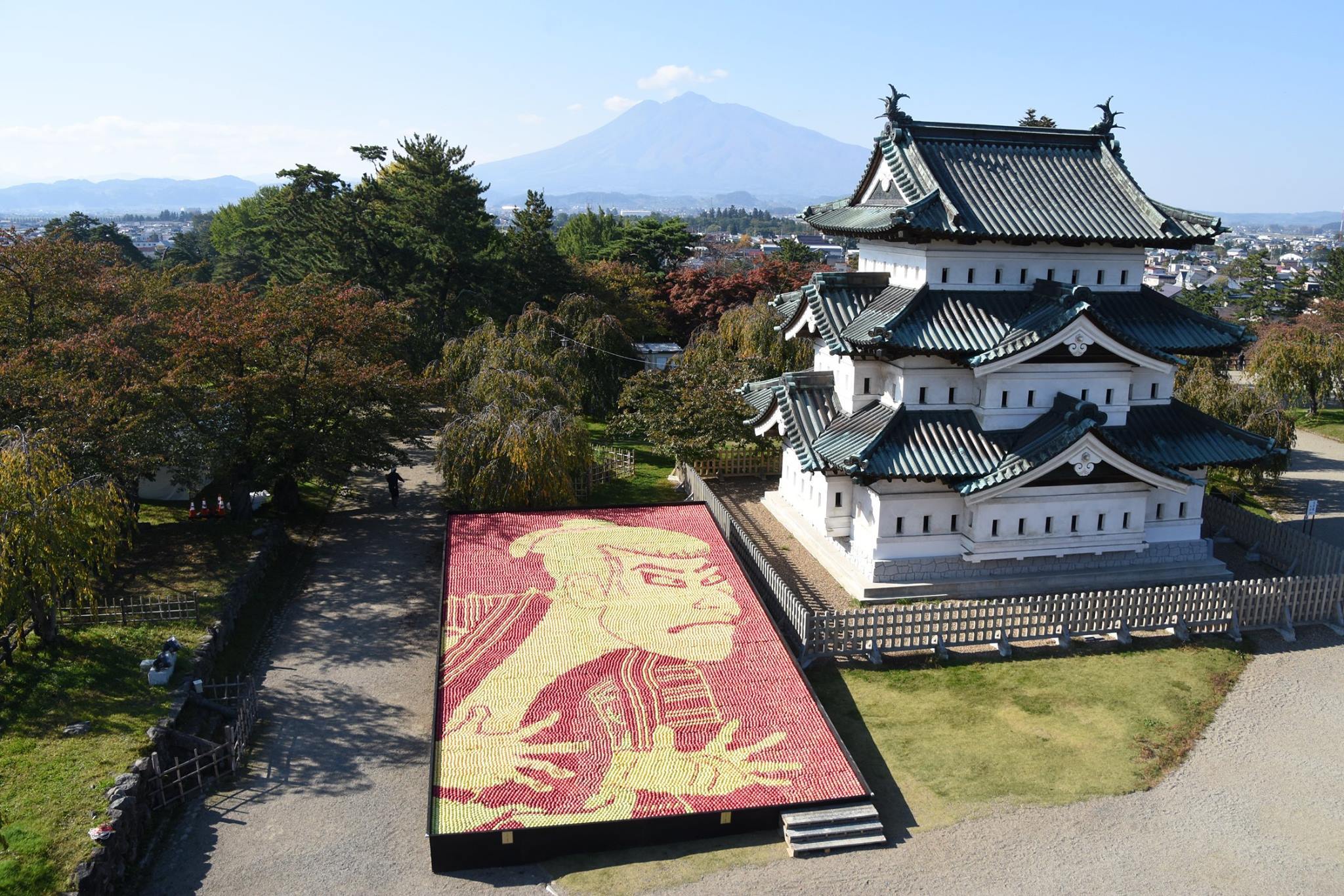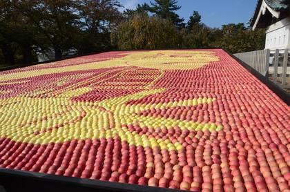 約3万個のリンゴを使用し、曳屋された弘前城と岩木山、そしてリンゴアートと今しか見ることのできない貴重な光景です!