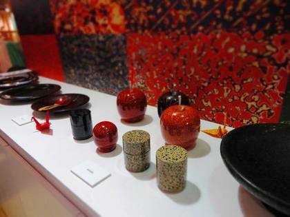 出展商品は、「津軽塗デザインプロジェクト」で喜多俊之氏がデザインしたテーブルやお皿等の「津軽塗」6種の他、「津軽こぎん刺し」7種の工芸品です。
