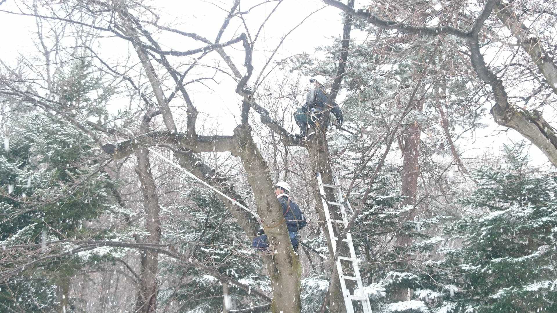 桜は剪定しないのが一般的と言われていますが、弘前公園ではりんごの管理技術をいかした独自の方法により桜が管理されており、毎年2月下旬から3月にかけて、園内2,600本の全ての木で剪定作業が行われます。