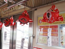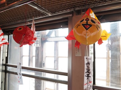 車内に飾られた個性的でかわいらしい金魚ねぷたは、沿線にある弘前市立文京小学校の児童が絵付けしたものです。