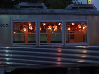 土・日曜日の夜間は、車内を金魚ねぷたの明かりだけにして運行します。
