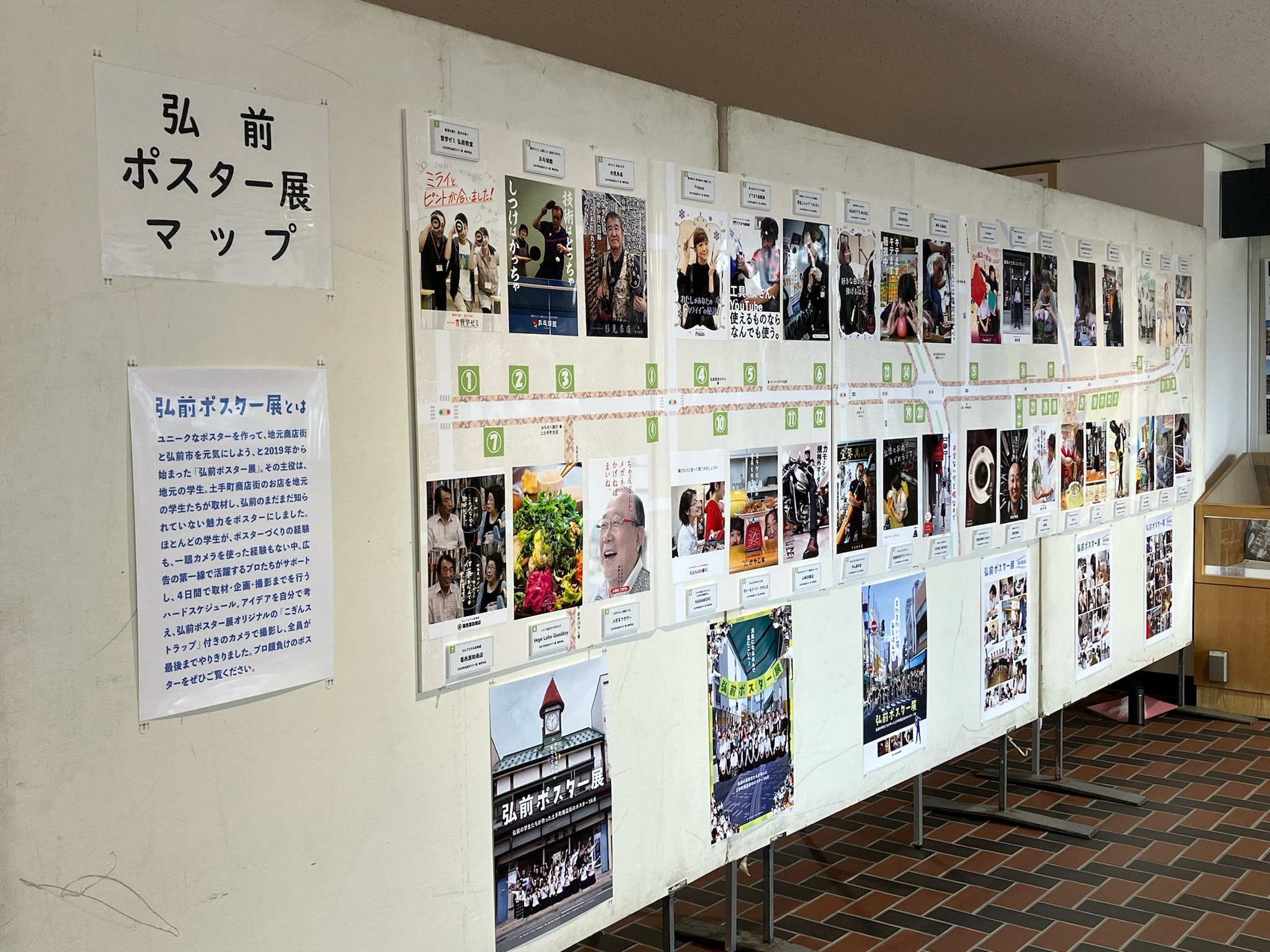 地元の学生が土手町商店街の店舗を取材し、ユニークなポスターを制作する「弘前ポスター展」。その集大成として、令和元年度からの3年間で学生が1人1店舗を担当して完成した全35店舗のユニークなポスターを弘前市役所にて展示しています。