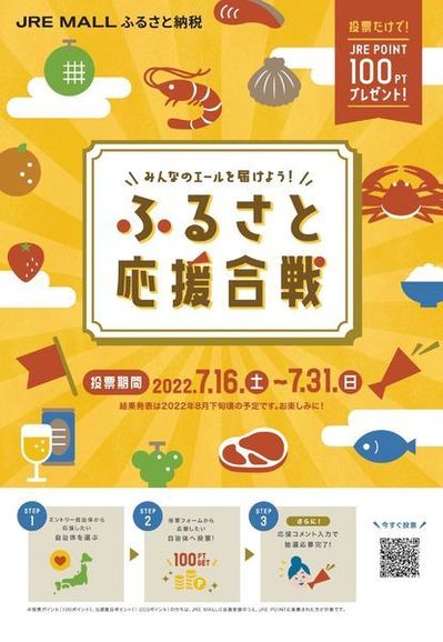 7月16日(土)~7月31日(日)の期間中、投票することでJRE POINT 100ポイントがもらえるほか、応援コメントを入力すると抽選で人気返礼品やJRE POINTが当たります!